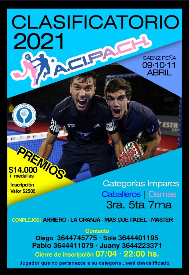 »» Evento: ACIPACH - Impares - Etapa 1 »» Localidad: Roque S. Peña »» Fechas: 09/04/2021 al 11/04/2021